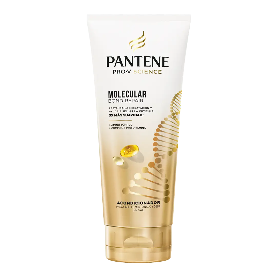 El Acondicionador Sellador Pantene Molecular Bond Repair ofrece hasta 3x más suavidad° y ayuda a recuperar la hidratación, sellando la cutícula y reparando la fibra capilar. Es ideal para cabellos muy dañados y débiles. Para usarlo, aplícalo después de la mascarilla intensiva, de medios a puntas, sobre el cabello húmedo. Usa el doble de la cantidad si tu cabello es largo o muy seco. Distribuye bien con las manos y enjuaga. °Suavidad en cabello húmedo vs shampoo sin ingredientes acondicionantes